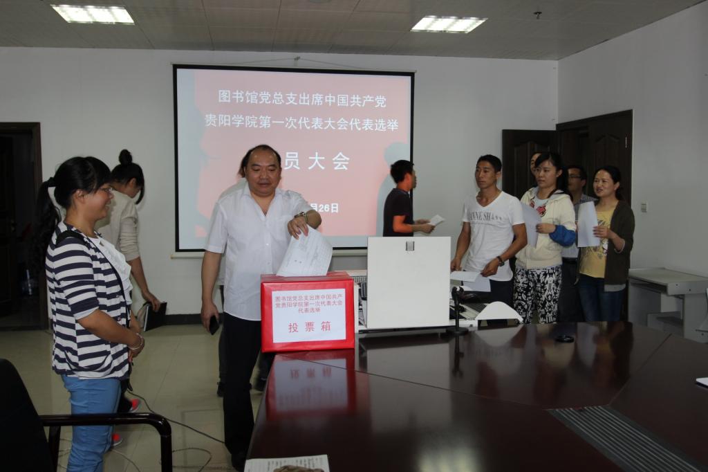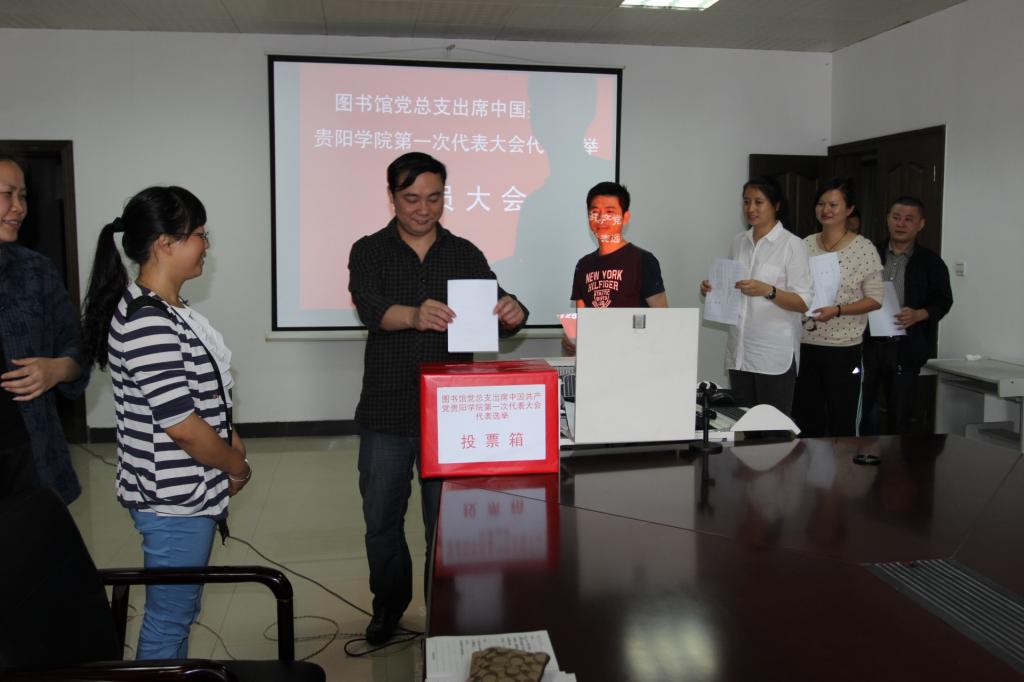 党员大会由党总支书记徐晓凤主持,会上传达学习了《关于做好贵阳学院第一次党代会代表选举工作的通知》。在充分发扬民主、广泛酝酿讨论的基础上,采用差额选举办法,以无记名投票方式,选举产生了图书馆党总支焦艳、徐晓凤、阮朝辉、贺电4名同志出席中国共产党贵阳学院第一次代表大会代表。