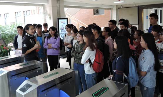 图书馆与各教学院协力合作,确定具体的培训时间及场次。入馆教育培训由图书馆利用讲解和服务窗口参观实践两个环节。图书馆利用讲解环节,结合新生专业方向,从“图书馆印象”、 “馆藏资源分布”、“图书的查找与借还”、“数字图书馆的利用”和“多媒体阅读”等方面给同学们作了详细的介绍,并就新生在使用图书馆时遇到的常见问题作了解答,引导新生文明使用图书馆。服务窗口参观环节,图书馆老师指导新同学们进行RFID自助借还系统和电子借阅机的实践操作。