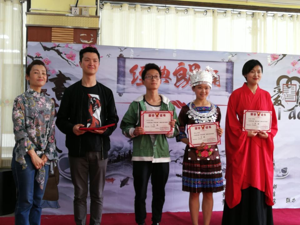 诵读比赛精彩纷呈,来自文化传媒学院的郑鹏程与教育科学学院的张玲带来的《可爱的中国》拉开了比赛的帷幕,表现不俗,赢得了热烈的掌声,与生物与环境工程学院的赵尧尧与电子通信工程学院的舒福合诵的《伞下的侗寨》、文化传媒学院李幸嫔带来的《我骄傲我是中国人》一起荣获三等奖。